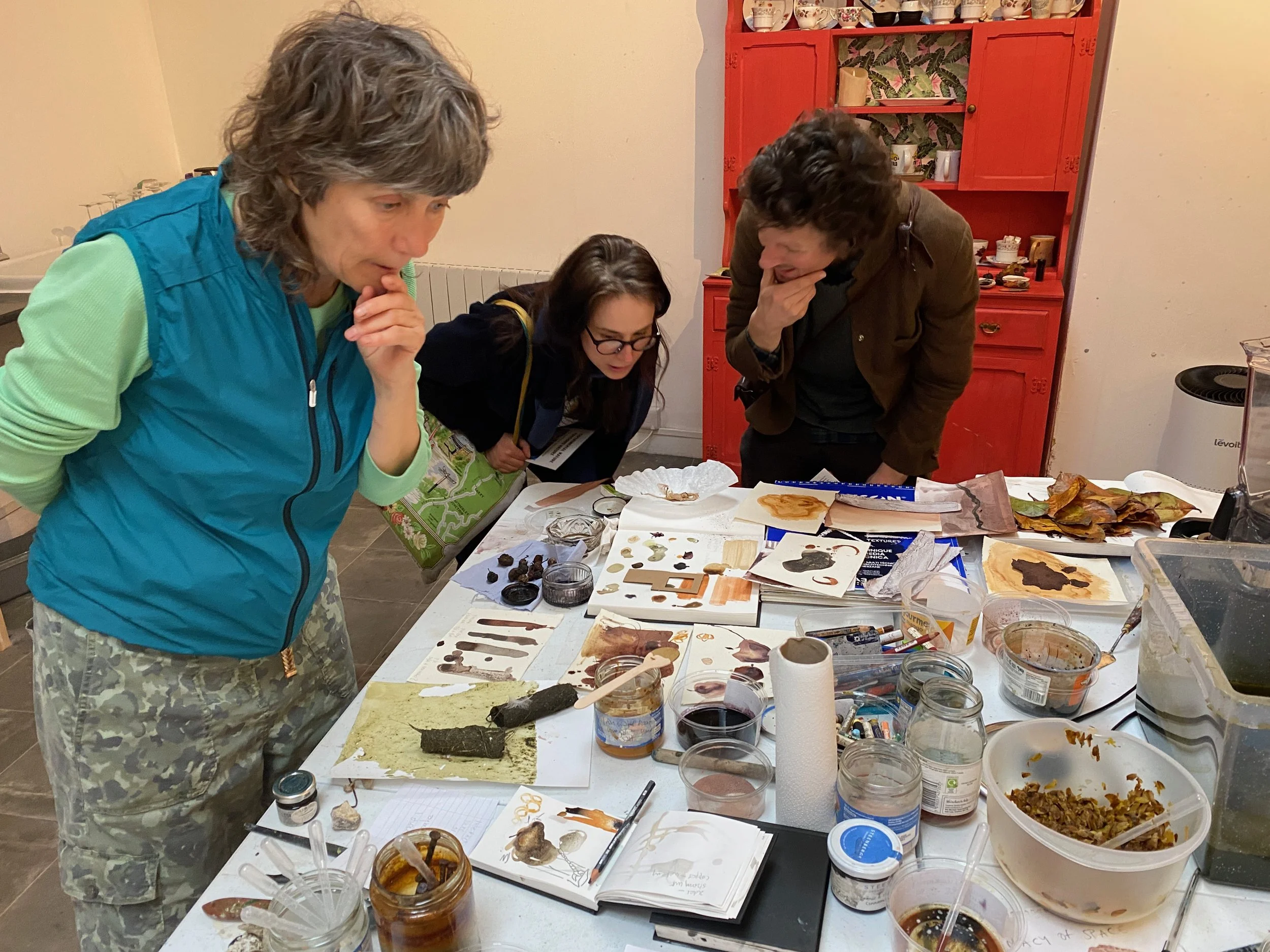 The second was a mentoring opportunity in early 2024. Ed and Lucy, artists from the Old Mill Palnackie shared their art practice, creating art materials from foraged natural materials to make pigments, ink, charcoal and paper. I’ve used this new knowledge to boil, pound, smash, sieve, press and coax goose and rabbit poo, crab apples, oak galls, alder and pine cones, bones, Belties’ fur and more into media and tools for mark-making, then use them to create 2D and 3D artworks.